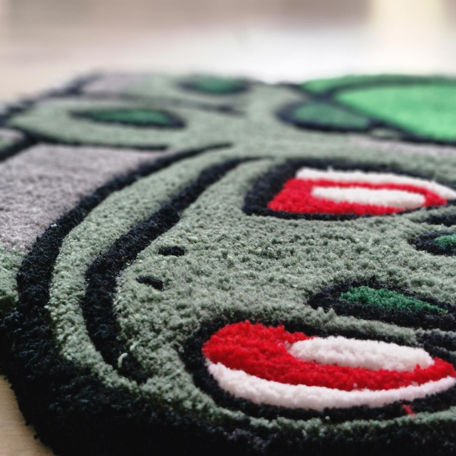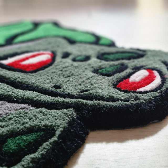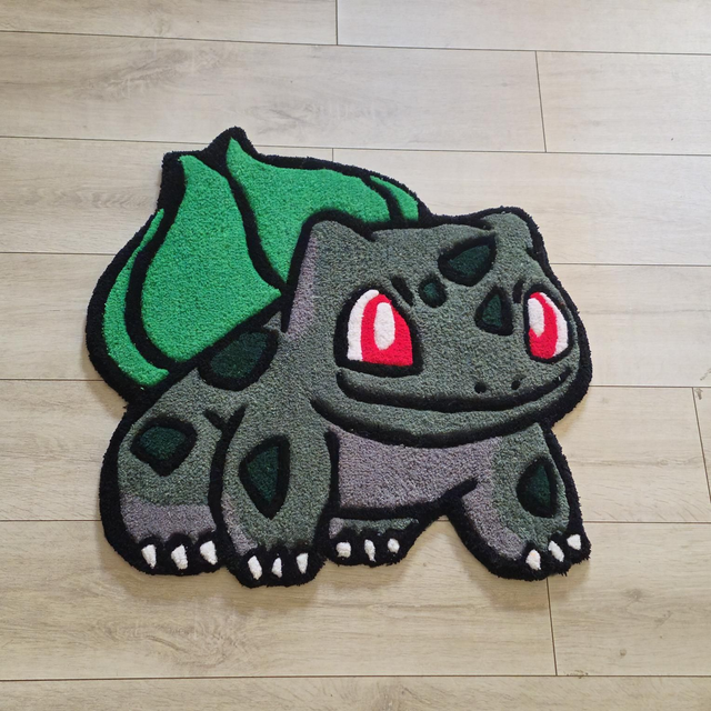 Tapis Bulbizarre en laine acrylique, inspiré du célèbre Pokémon de départ de la région de Kanto.
